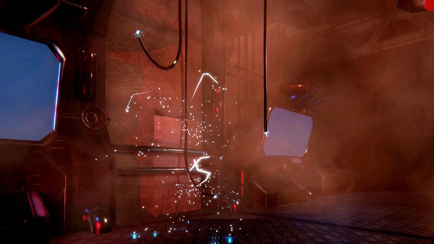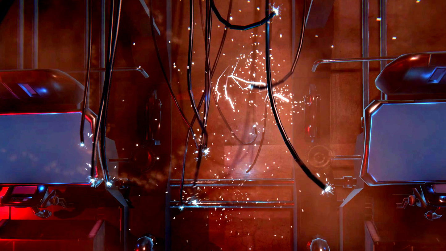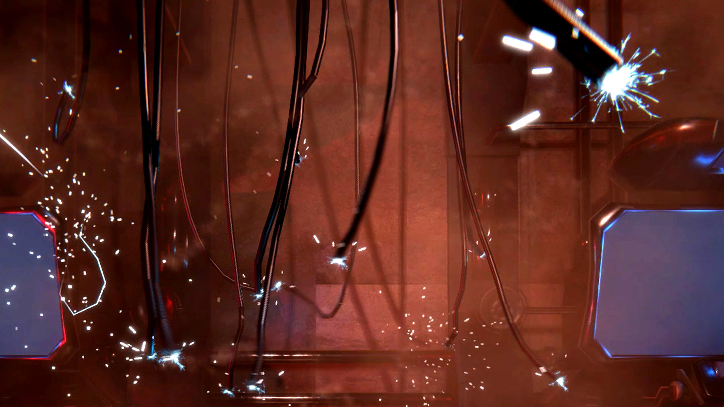 A large electrical explosion including electricity, smoke, a variety of sparks, colliding metal debris (cogs, springs, metal pieces etc) and real-time light.