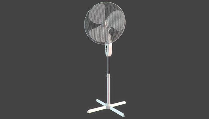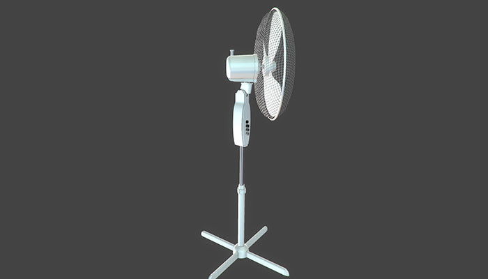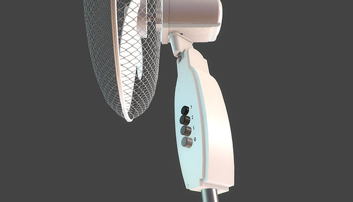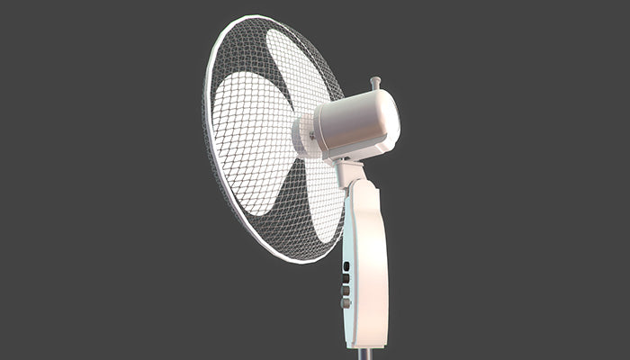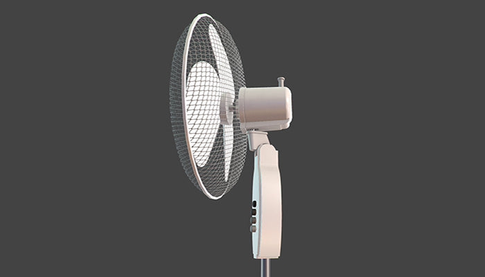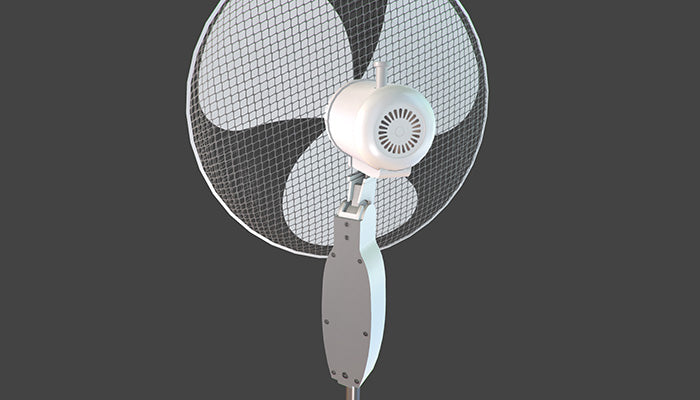 The fan slowly pans left and right while the blades spin. Additional subtle animation touches are included, such as gentle vibrations along the head and body of the appliance.