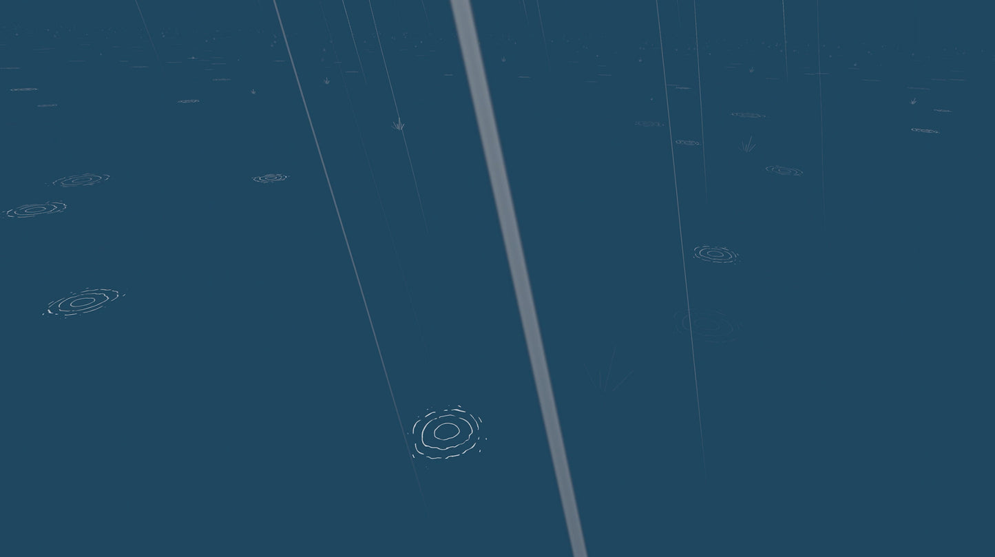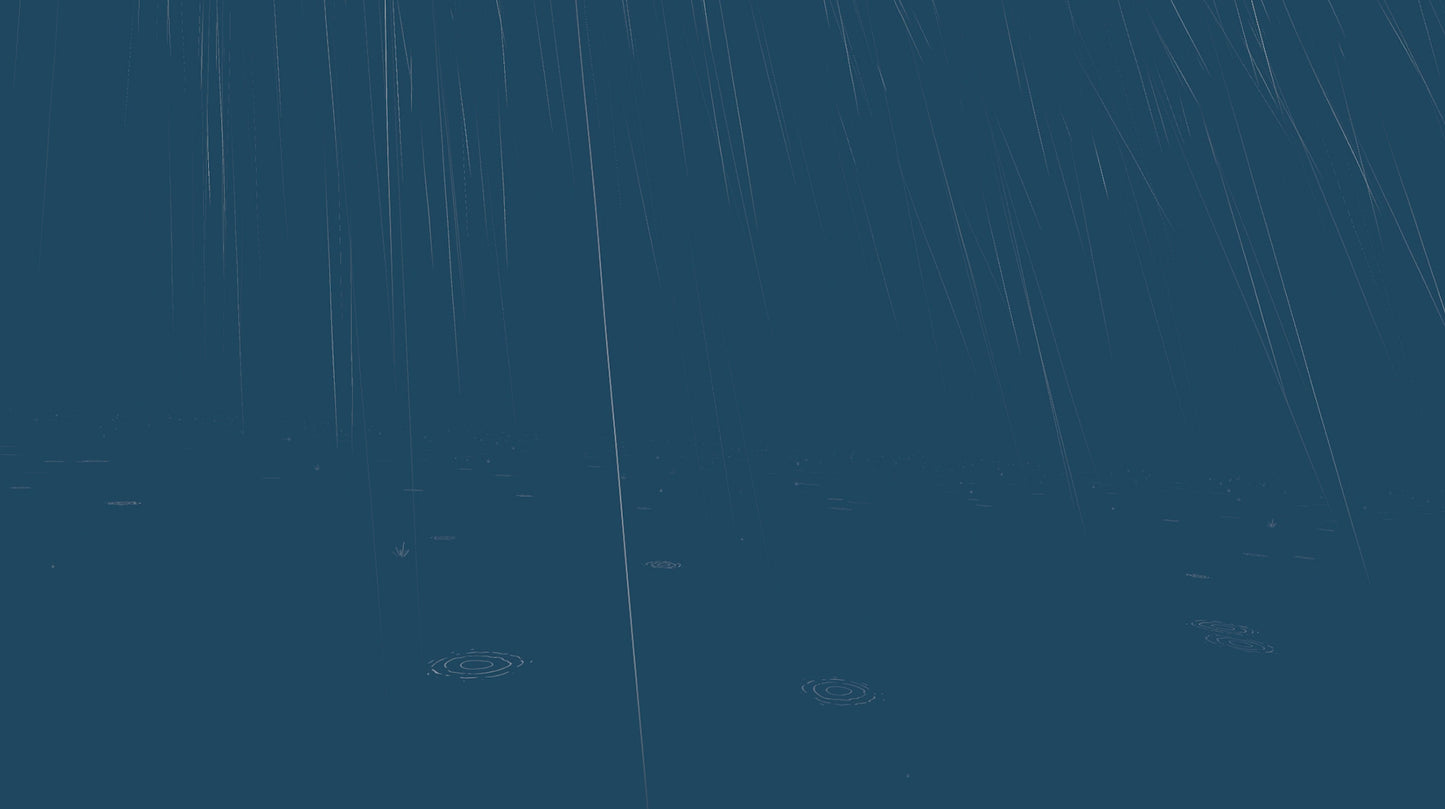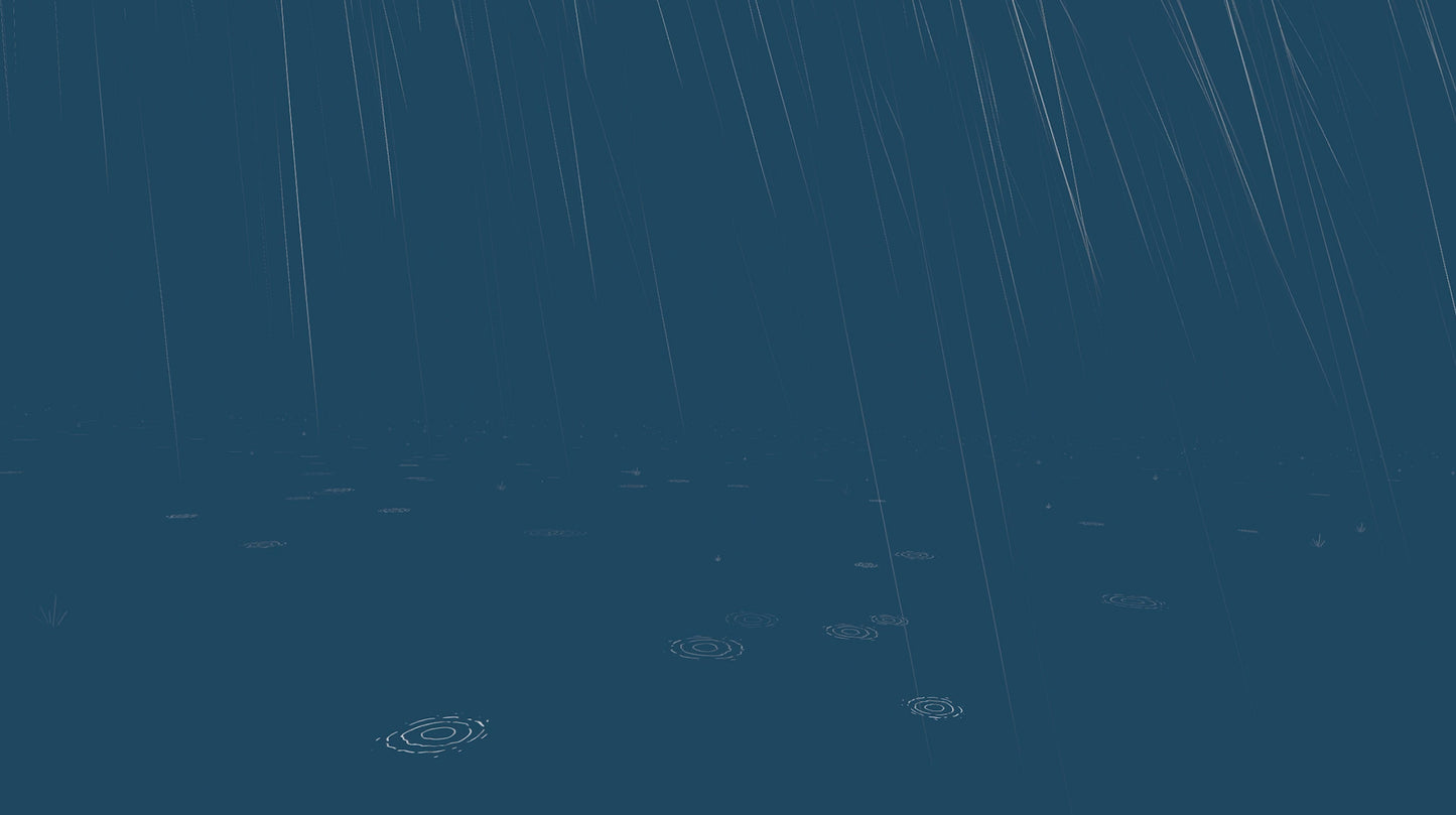 A stylized cartoon rain complete with rain drops, ground splashes and ground puddle ripples.